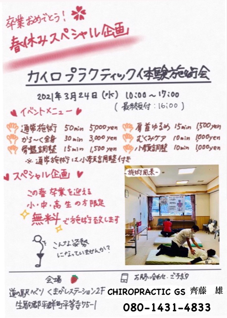 この春卒業の小中高生の方は無料でカイロプラクティック施術体験出来ます🙆♂️