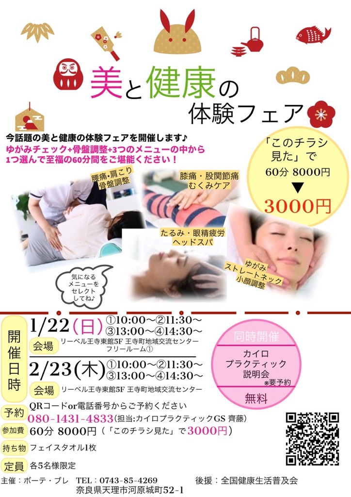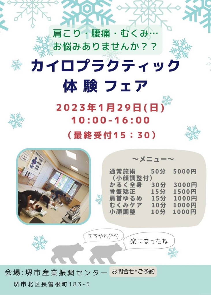 1月29日10:00〜16:00までカイロプラクティック体験フェアを堺市産業振興センターにて開催致します👏